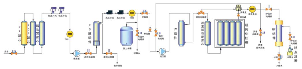 自来水→PP棉滤芯→碳粉滤芯→PP棉滤芯→增压泵→反渗透R.O单元→纯水→超纯化单元→纯水超纯水取水口